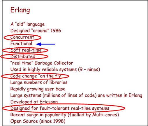 Check out this slide from Erlang language co-designer Joe Armstrong’s InfoQ lecture: “Erlang – software for a concurrent world“. I’ve circled the features that have drawn me to Erlang because I’m currently developing product software where those qualities are hugely important to my customers. Despite their importance to success, they’re almost always given second class status by programmers and managers because they’re not domain-specific, “glamorous“, features.