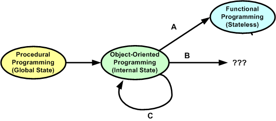So, what do you think? What will eventually usurp the object-oriented way of thinking for programmers and designers in the future? The universe is constantly in flux and nothing stays the same, so the status quo loop modeled by option C below will be broken sometime, somewhere, and somehow. No?
