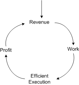 In the RWEP loop example below, revenue leads to work, which leads to execution, which leads to profit, which leads to more revenue. If a profit seeking organization is well run, the org leaders vigilantly keep track of the “whole” RWEP loop and influence each malleable component so that the loop is positively reinforced and the org prospers. Neglecting one or more of the dominant RWEP loop components can lead to an unstable system that breaks the loop and collapses the system.