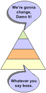 In a followup to my first post on GM’s initial BS attempt to dismantle their horrendous do-nothing-but-line-management’s-pocket-with-dough Command And Control Hierarchy (CCH), I submit this freshly minted AP article. It describes yet another management shake up at post-bankruptcy, taxpayer-money-sucking GM. The “new” (LOL!) leadership continues to pray that the feeble and well worn tradition of sloganeering and cajoling will stave off annihilation. Geeze, these elite hierarchs are really doing quite a job earning their seven figure paychecks, dontcha think?