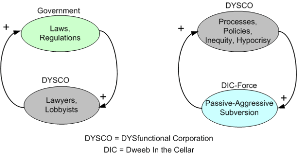 The two cause-effect loop diagrams below crystallize the situation, no? On the left, more regulation begets more lobbying and lawyering – which begets more regulation. Bummer. On the right, more red tape begets more subversion – which begets more red tape. Double freakin’ bummer.