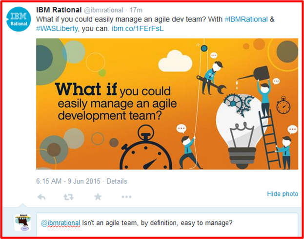 I can see all the LeSS (Large Scale Scrum) and SAFe (Scaled Agile Framework) consultants salivating over all the moolah they can suck out of IBM. Gotta give ’em credit for anticipating the new market for “scaling Agile” and setting up shop to reap the rewards from struggling, deep-pocketed, behemoths like IBM.