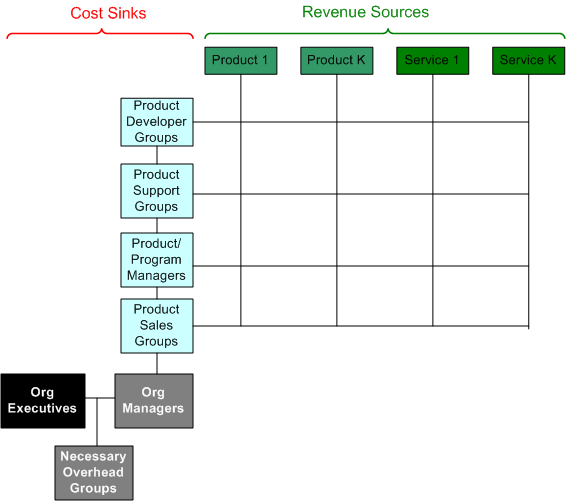 - To reinforce why the org exists and de-emphasize who is “more important” than who, publish a product and/or service-centric org chart with products/services across the top and groups, including all managers, down the side. Preferably, the managers should be on the bottom propping up the org. (See figure below).
