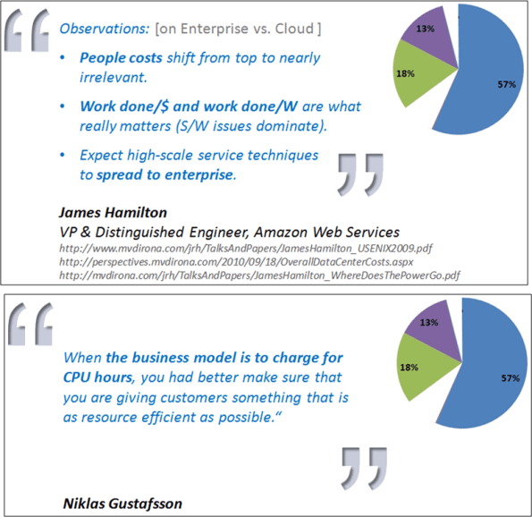 Unless the large movement of business applications to the cloud is the latest fad du jour, the following two slides show that the largest software development and maintenance costs will shift from labor to compute efficiency. Thus, it doesn’t matter how programmer friendly your language is and how low the salaries you pay are, you might find that your costs are going up because of power drain in massive data centers and time spent frantically optimizing VM-based code that’s relatively slower and bigger.