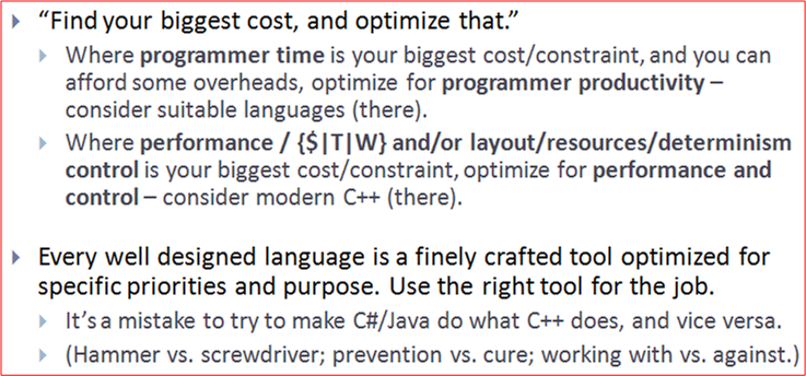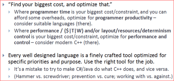 In this next slide, Herb contrasts C++11’s adherence to its more open “trust the programmer” philosophy against the more closed “we know what’s good for you” C#/Java philosophy.