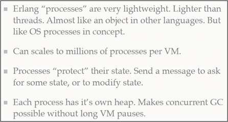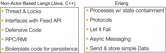 The slide below implies that the methods of OOP-based languages designed to handle post-2000 concurrency and scalability problems are rickety graft-ons; whereas the features and behaviors required to wrestle them into submission are seamlessly baked-in to Erlang’s core and/or its OTP library.