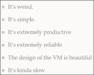 To prove his point, Mr. Katz uses Java as an example of “getting it right“. When Java arrived on the scene in the mid-90’s, it was dirt slow compared to C and C++. But because Java’s syntax was C-like and it didn’t suffer from the frustrating quirks and gotchas of C/C++, it was embraced quickly and massively by the software industry. This lead to massive investment, which lead to large JVM performance increases and a boatload of productivity-enhancing development tools.