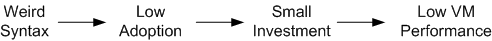 Damien says that Erlang’s weird Prolog-like syntax prevents massive adoption; which prevents lack of massive investment; which prevents massive VM performance improvement.