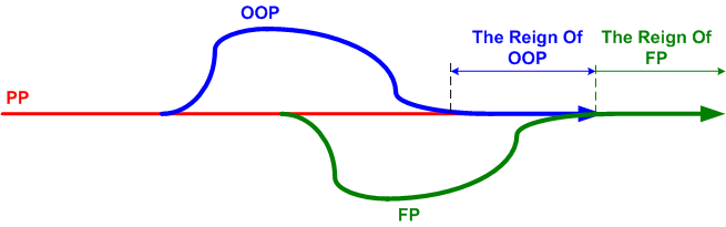 As the figure below from Neal Ford’s OSCON “Functional Thinking” talk reveals, it took a glacial 16 years for Object-Oriented Programming (OOP) to firmly supplant Procedural Programming (PP) as the mainstream programming style of choice. There was no revolution.