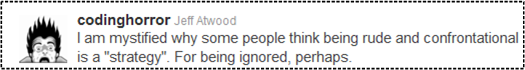 All the above snippets were strategically and carefully culled from various discussions posted on the wonderful Joel Spolsky and Jeff Atwood site: Stackoverflow.com.