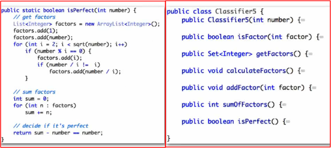 While watching Neal Ford’s terrific “Agile Engineering Practices” video series, I paid close attention to the segment in which he interactively demonstrated the technique of Test Driven Development (TDD). At the end of his well-orchestrated example, which was to design/write/test code that determines whether an integer is a perfect number, Mr. Ford presented the following side-by-side summary comparison of the resulting “traditional” Code Before Test (CBT) and “agile” TDD designs.