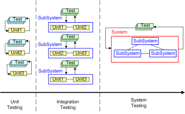 For a large, complex software system that can be represented via an instantiation of the above template, three levels of testing are required to be performed prior to fielding a system: unit, integration, and system. Unit testing shakes out some (hopefully most) of the defects in the local, concretely visible, micro-behavior, of each of possibly thousands of units. Integration testing unearths the emergent behaviors, both intended and unintended, of each individual subsystem assembly. System level, end-to-end, testing is designed to do the same for the intended/unintended behaviors of the whole shebang.