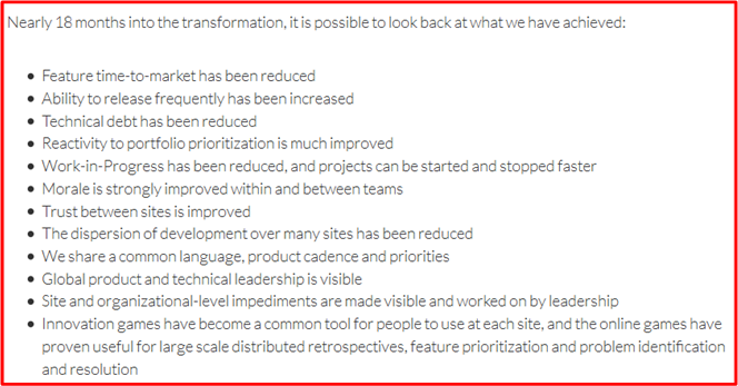 Thanks to a social media friend, I was directed to an agile transformation case study written by a management consultant and posted on the consultancy’s site along side several other huge success stories. At the end of the long writeup, the following outcomes were asserted: