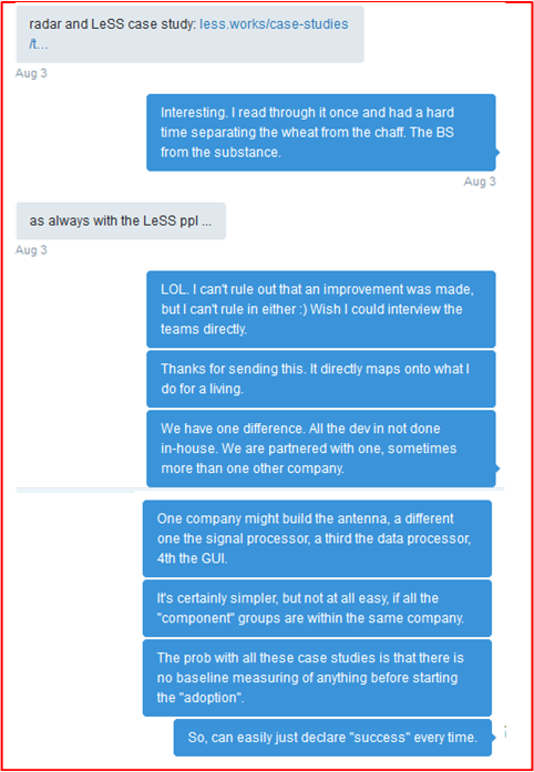 A dear twitter friend recently sent me a link to this case study written by a LeSS management consultant: “Thales Surface Radar”. Since I’ve been an active contributor to the development of multi-million dollar air defense and air traffic control radars for decades, I was excited to finally see a case study directly applicable to my domain of interest.