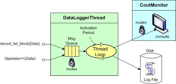 Objects of the DataLoggerThread class run in their own thread of execution – transparently in the background to mainline user code. On construction, each object instance creates a mutex-protected, inter-thread queue and auto-starts its own thread of operation behind the scenes. On destruction, the object gracefully self-terminates. During runtime, each DataLoggerThread object polls its input queue and formats/writes the queue entries to the global console (which is protected from simultaneous, multiple thread access by a previously developed CoutMonitor class) and/or to a user-named disk log file. The queue is drained of all entries on each (configurable,) periodic activation by the underlying (Boost) threads library.