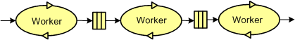 The figure below models a program in which a pipeline of worker threads communicate with each other via message passing. The accordion thingies ‘tween the threads are message queues that keep the threads loosely coupled and prevent message bursts from overwhelming downstream threads.