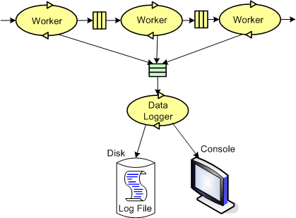 During the process of writing one of these multi-threaded programs to handle bursty, high rate, message streams, I needed a way to periodically extract state information from each thread so that I could “see” and evaluate what the hell was happening inside the system during runtime. Thus, I wrote a generic “Data Logger” thread and added periodic state reporting functionality to each worker thread to round out the system: