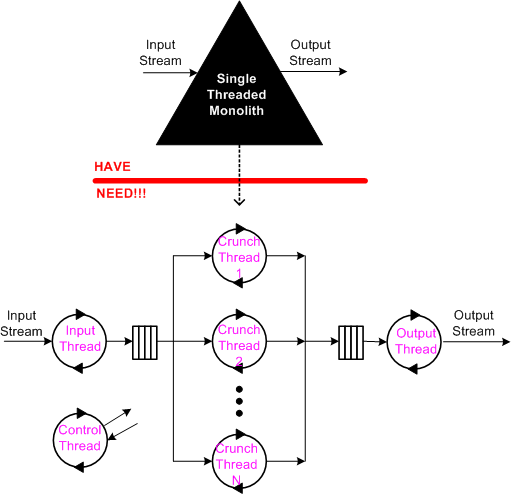 Because the code is CPU intensive and single threaded, it’s not scalable to higher input data rates and its viability has hit “the wall”. Thus, besides refactoring the existing functionality into a more maintainable design, I have to simultaneously morph the mess into a multi-threaded structure that can transparently leverage the increased CPU power supplied by multicore hardware.