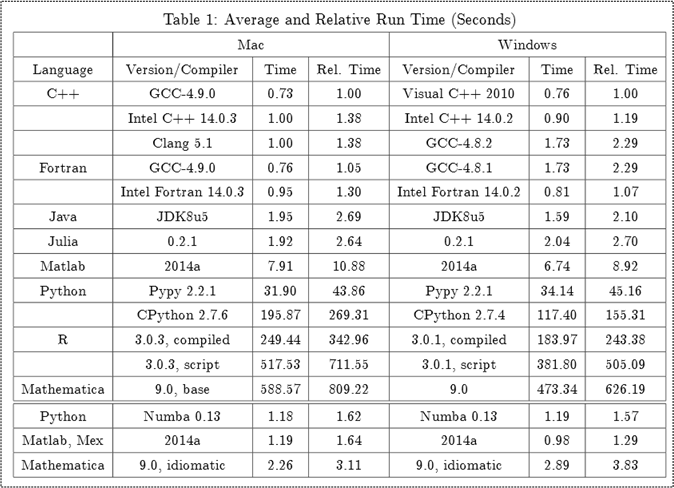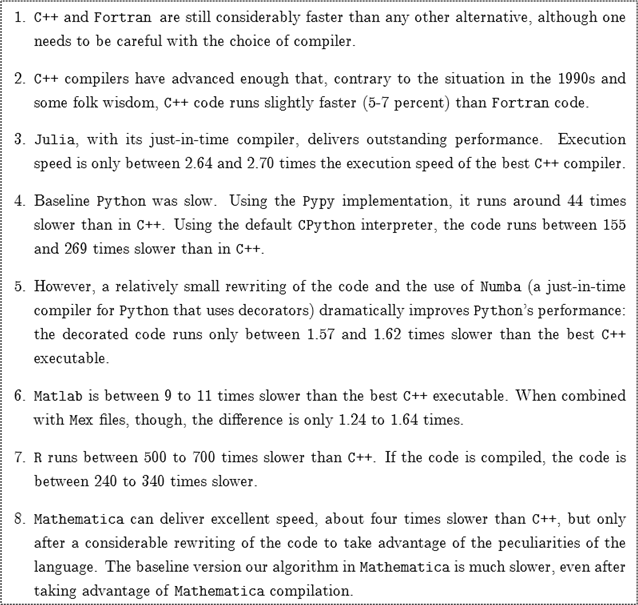 Somehow, I stumbled upon an academic paper that compares programming language performance in the context of computing the results for a well-known, computationally dense, macro-economics problem: “the stochastic neoclassical growth model“. Since the results hoist C++ on top of the other languages, I felt the need to publish the researchers’ findings in this blog post :). As with all benchmarks, take it with a grain of salt because… context is everything.