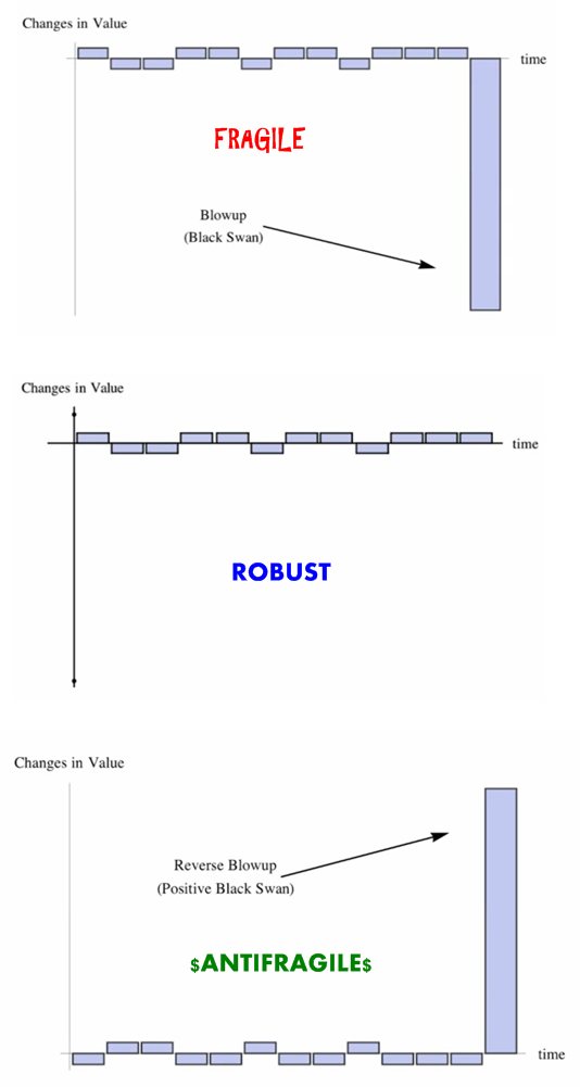 In case you are new to the concept of antifragility, consider the figure below. A fragile system is one in which, as the magnitude of an external stressor is applied, the harm it experiences increases non-linearly. An antifragile system is the exact opposite. It is more than simply resilient or robust. It actually gains from volatility (up to a point, of course).