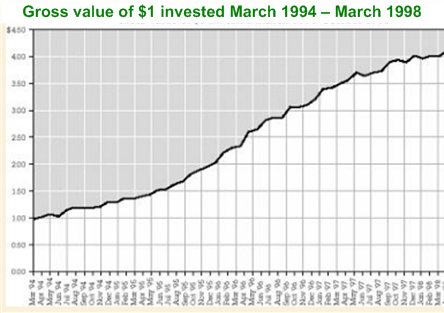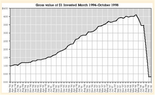 In case you didn’t know, LTCM was a high-falutin’ hedge fund that racked up huge investment gains for four years in 1998 before exploding with a bang that almost shook the financial system to its core. As the following graph shows, if you were privileged enough to have invested $1 in LTCM in March 1994, you would have quadrupled your money by March 1998. Four hundred percent in four years. W00t!
