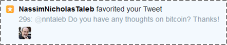 While browsing my twitter feed, it somehow dawned on me that Nassim Taleb would be the perfect person to ask about bitcoin. When I did so, all I got was this lousy tee shirt 🙂