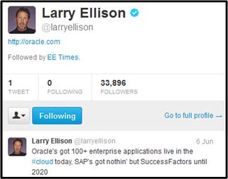 In early September, I noted in a post that Oracle Inc. CEO Larry Ellison had broadcast his first and only tweet on June 6th. Out of curiosity, I moseyed on over to his twitter home page to check up on his “status“: