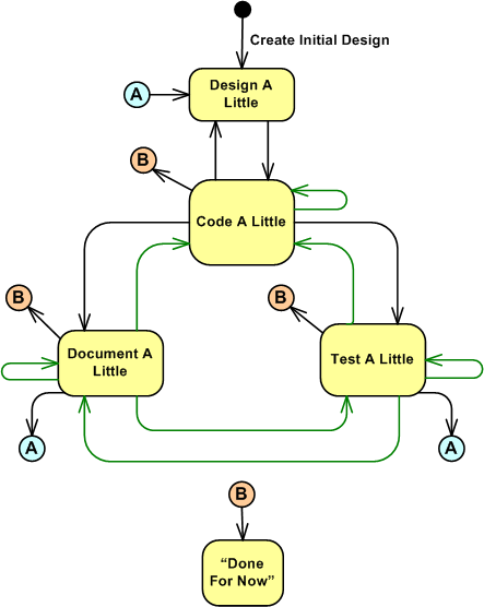 The UML state transition diagram below models the PAYGO states of operation along with the transitions between them. Even though the diagram indicates that the initial entry into the cyclical and iterative PAYGO process lands on the “Design A Little” state of activity, any state can be the point of entry into the process. Once you’re immersed in the process, you don’t kick out into the “Done For Now” state until your first successful product handoff occurs. Here, successful means that the receiver of your work, be it an end user or a tester or another programmer, is happy with the result. How do you know when that is the case? Simply ask the receiver.