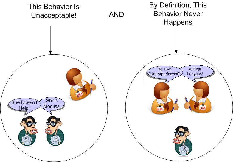 In some so-called performance evaluation systems, an “authorized” evaluator (manager) talks to an evaluatee’s peers to get the “real scoop” on the behavior, oops, I mean the “performance” of the evaluatee. But can’t that be interpreted (by unreasonable people, of course) as a sanctioned form of talking behind one’s back?