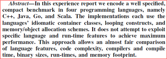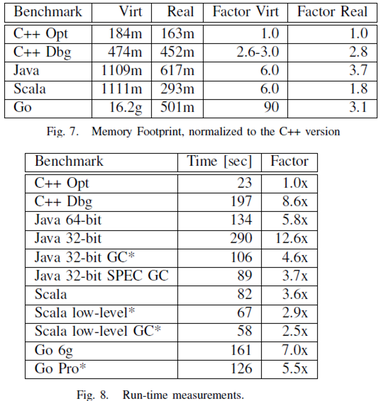 I recently stumbled upon this interesting paper on programming language performance from Google researcher Robert Hundt : Loop Recognition in C++/Java/Go/Scala. You can read the details if you’d like, but here are the abstract, the conclusions, and a couple of the many performance tables in the report.