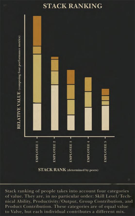 …stack ranking is done in order to gain insight into who’s providing the most value at the company and to thereby adjust each person’s compensation to be commensurate with his or her actual value. Valve pays people very well compared to industry norms. Our profitability per employee is higher than that of Google or Amazon or Microsoft, and we believe strongly that the right thing to do in that case is to put a maximum amount of money back into each employee’s pocket. Valve does not win if you’re paid less than the value you create. Over time, compensation gets adjusted to fit an employee’s internal peer-driven valuation. – The Valve Employee Handbook