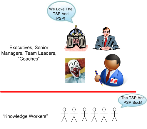 On the other hand, I’m turned off when he starts promoting his arcane and overly-pedantic TSP–PSP methodology. To me, his heavy, right wing measurement and prescriptive planning methods are an accountant’s dream and an undue burden on left leaning software development teams. Also, in at least his final two books, he targets his expert TSP-PSP way at “executives, senior managers, coaches and team leaders” while implying that knowledge workers are “them” in the familiar, dysfunctional “us vs. them” binary mindset (that I suffer from too).