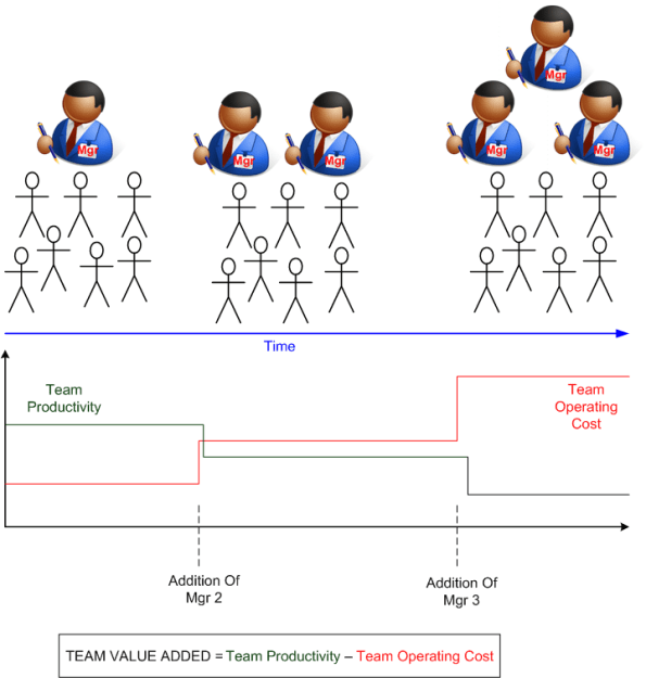 The figure below shows the result of two attempts to increase the productivity of a hypothetical DICteam. In this totally concocted and fictional example, the nervous dudes in the penthouse (not shown in the figure) keep adding specialized managers to the team to fill voids that they perceive are keeping performance from improving. However, since the SCOLs never baseline the TEAM_VALUE_ADDED metric before each brilliant move, or track its increase or decrease with time, they have no idea whether they have achieved their goal. Because SCOLsters think they’re infallible, they just auto-assume that their brilliant moves work out as expected.