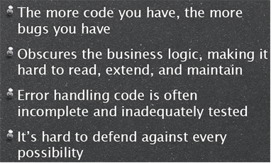The following “borrowed” snippet from a recent Steve Vinoski QCon talk describes the well worn technique of defensive programming: