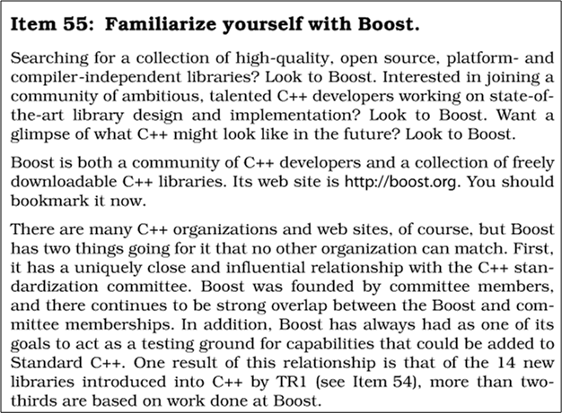 To support my yearning for learning, I continuously scan and probe all kinds of forums, books, articles, and blogs for deeper insights into, and mastery of, the C++ programming language. In all my external travels, I’ve never come across anyone in the C++ community that has ever trashed the boost libraries. Au contraire, every single reference that I’ve ever seen has praised boost as a world class open source organization that produces world class, highly efficient code for reuse. Here’s just one example of praise from Scott Meyers‘ classic “Effective C++: 55 Specific Ways To Improve Your Programs And Designs“: