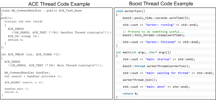 Years ago, a smart, highly productive, and dedicated developer who I respect started building a distributed “framework” on top of the ACE library set (not as a formal project – on his own time). There’s no doubt that ACE is a very powerful, robust, and battle-tested platform. However, because it was designed back in the days when C++ compiler technology was immature, I think its API is, let’s say “frumpy“, unconventional, and (dare I say) “obsolete” compared to the more modern Boost APIs. Boost-based code looks like natural C++, whereas ACE-based code looks like a macro derived dialect. In the functional areas where ACE and Boost overlap (which IMHO is large), I think that Boost is head over heels easier to learn and use. But that’s just me, and if you’re a long-time ACE advocate you might be mad at me now because you’re blinded by your bias – just like I am blinded by mine.