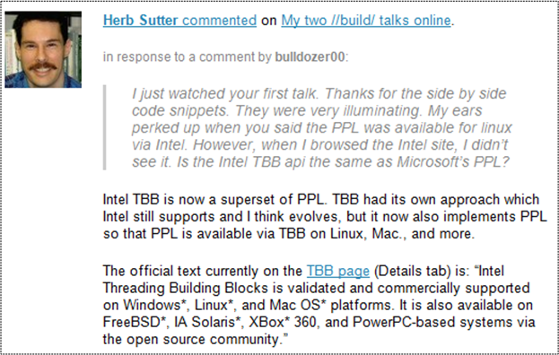 Note: As a side bonus of watching the video, I found out that the Microsoft Parallel Patterns Library is now available for Linux (via Intel).