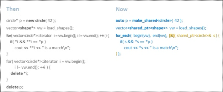 Here’s an example (which I hope isn’t too blurry) in which the C++11 code is shorter and obsoletes the need for writing an infamous”new/delete” pair.