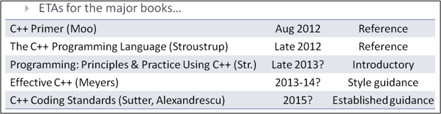 Note that even though he has some C++11/14 training material available for purchase on his web site, none of Scott Meyers‘ “Effective” series of C++ books has been updated yet. Fear not. The first in the series, “Effective C++11/14“, is coming to market in early 2014. The description of Scott’s upcoming GoingNative 2013 session, titled “An Effective C++11/14 Sampler“, reads as follows: