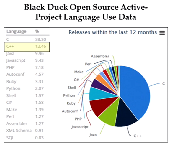 Even though C++’s market niche has shrunk considerably in the 21st century, it is still widely used throughout the industry. The following chart, courtesy of Scott Meyers’ recent talk at Facebook, shows that the old-timer still has legs. The pending C++14 and C++17 updates virtually guarantee its relevance far into the future; just like the venerable paper clip and spring-loaded mouse trap.