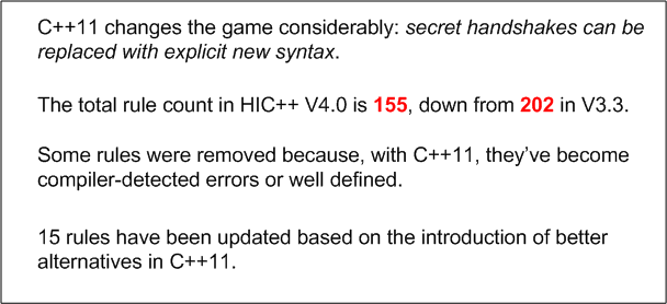 It seems that the authors of the “High Integrity C++” coding standard agree with my assessment. In a white paper summarizing the changes to their coding standard, here is what they have to say: