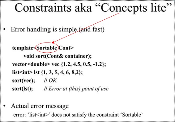 The “concept” being highlighted in this example is “Sortable“. Once the compiler knows that the sort<T> function requires its template argument to be “Sortable“, it checks that the argument type is indeed sortable. If not, the error message it emits will be something short, sweet, and to the point.