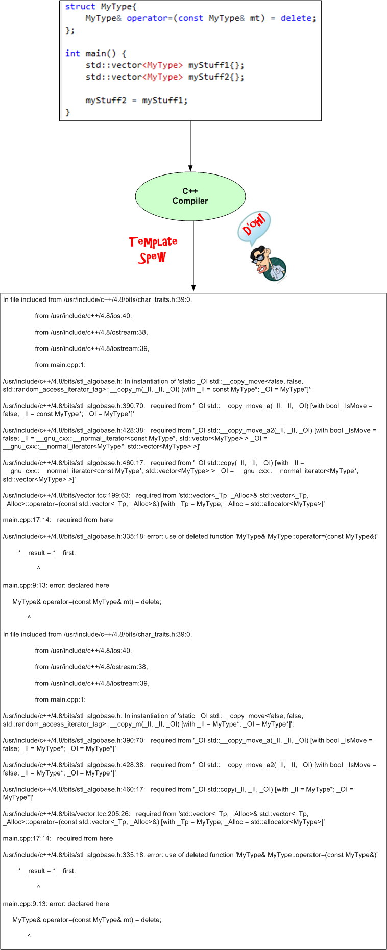 The above example doesn’t do justice to the havoc the mighty TS dragon can wreak on the mind because the problem (std::vector<T> requires its template arg to provide a copy assignment function definition) can actually be inferred from a couple of key lines in the sea of TS text.