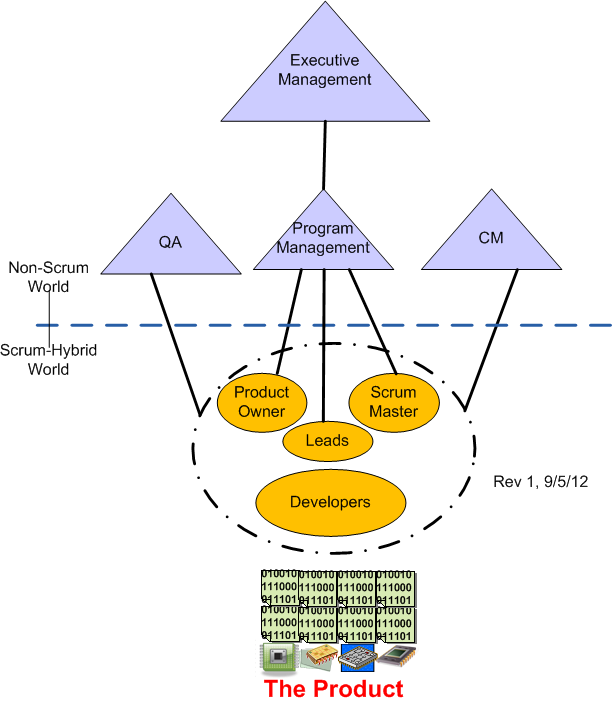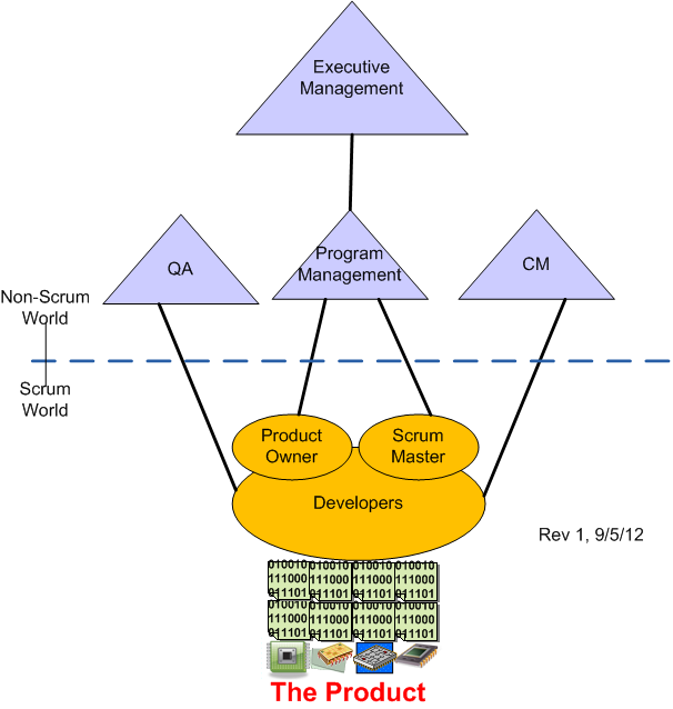 According to the short and sweet Schwaber/Sutherland Scrum Guide, a Scrum team is comprised of three, and only three, simple roles: the Product Owner, the Scrum Master, and the Developers. One way of “interfacing” a flat and collaborative Scrum team to the rest of a traditional hierarchical organization is shown below. The fewer and thinner the connections, the less impedance mismatch and the greater the chances of efficient success.