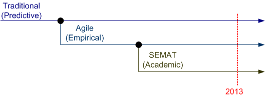 The most recent fork in the methodology march is the cerebral SEMAT (Software Engineering Method And Theory) movement. SEMAT can be interpreted (perhaps wrongly) as a counter-revolution against the success of Agile by scorned, closet traditionalists looking to regain power from the agilistas.
