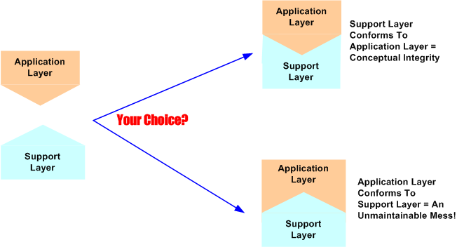 Now assume that a support layer for a different application layer already exists in your org – the investment has been made, it has been tested, and it “works” for those applications it’s been integrated with. As the left portion of the figure below shows, assume that the pre-existing support layer doesn’t match the structure of your yet-to-be-developed application layer. They just don’t naturally fit together. Would you: