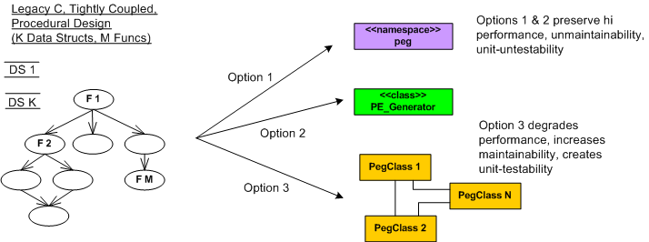 In the figure below, I model the procedural mess that is “peg” on the left as an M function call tree in which many of the functions perform CRUD accesses on a set of K interrelated global data structures. Trust me when I say that K and M are non-trivial, double digit numbers. D’oh!