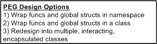 Assume that as a sub-task of redesigning a BBoM chunk of legacy software for scalability (single thread to mutliple threads), you have to “do something” with a subset of high performance, but computationally dense and tricky, C procedural code. Let’s call the functionality implemented by this code “peg“.