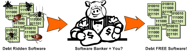 “Hi, I’m a software banker and I can help you consolidate and pay off all your software debt. Trust me, I will solve all your maintenance, oops, I mean debt, problems in no time flat. Plus, my fee is reasonable.” – Bulldozer00