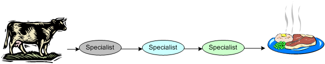 In software development, above a certain (unknown) level of complexity and size, specialists, dependencies, and handoffs are required to have any chance of getting the work done and the product integrated. Cross-functional teams, where every single person on the team knows how to design and code every functional area of a product, is an unrealistic pipe dream for anything but trivial products.